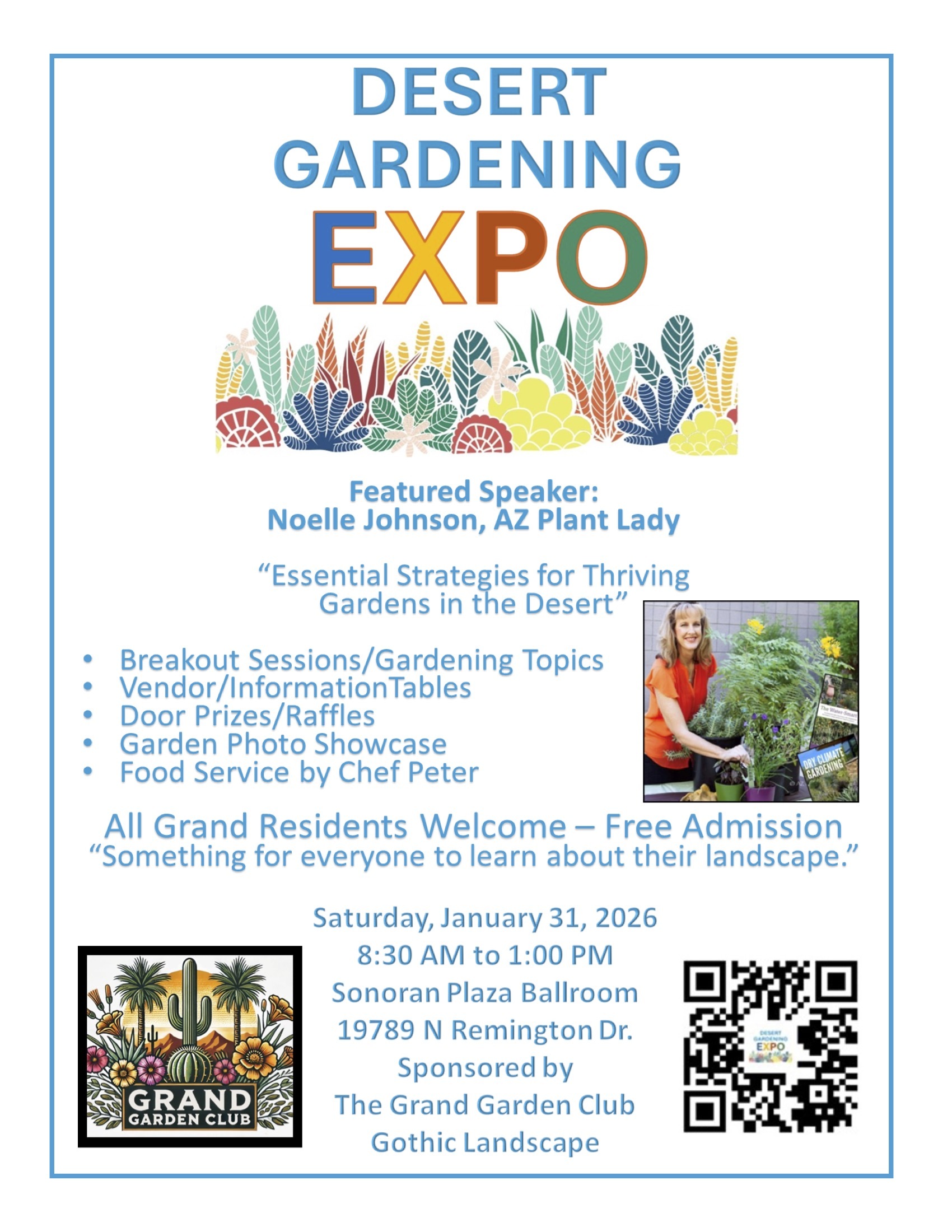 Full morning of activities starting with a Keynote speech by AZ Plant Lady, Noelle Johnson "Essential Strategies for Thriving Gardens in the Desert" followed by 5 Breakout Sessions led by experts in the field. These sessions will be held at 2 times, so each registrant can select 2 Breakout Sessions.